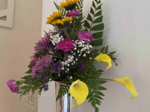 After prayerful consideration, since January 2024, we have had real flower arrangements on the first Sunday of each month, delivered by Marcus Hook Florist. On that first Sunday, we list all the flower sponsor dedications we’ve collected money for in that month. On the other Sundays, we will use either live green plants or faux flower arrangements to decorate our altar space.