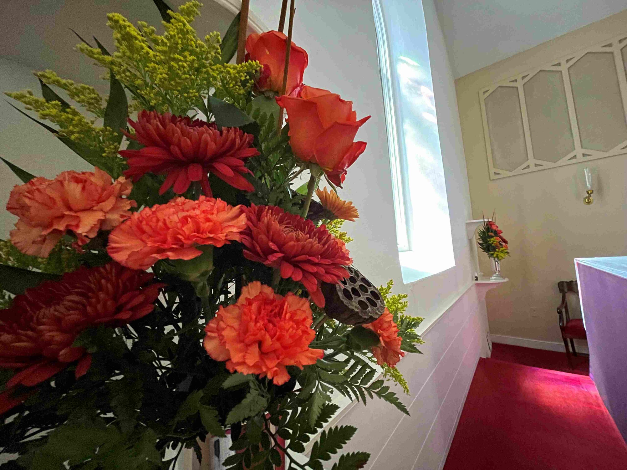 After prayerful consideration, since January 2024, we have had real flower arrangements on the first Sunday of each month, delivered by Marcus Hook Florist. On that first Sunday, we list all the flower sponsor dedications we’ve collected money for in that month. On the other Sundays, we will use either live green plants or faux flower arrangements to decorate our altar space.